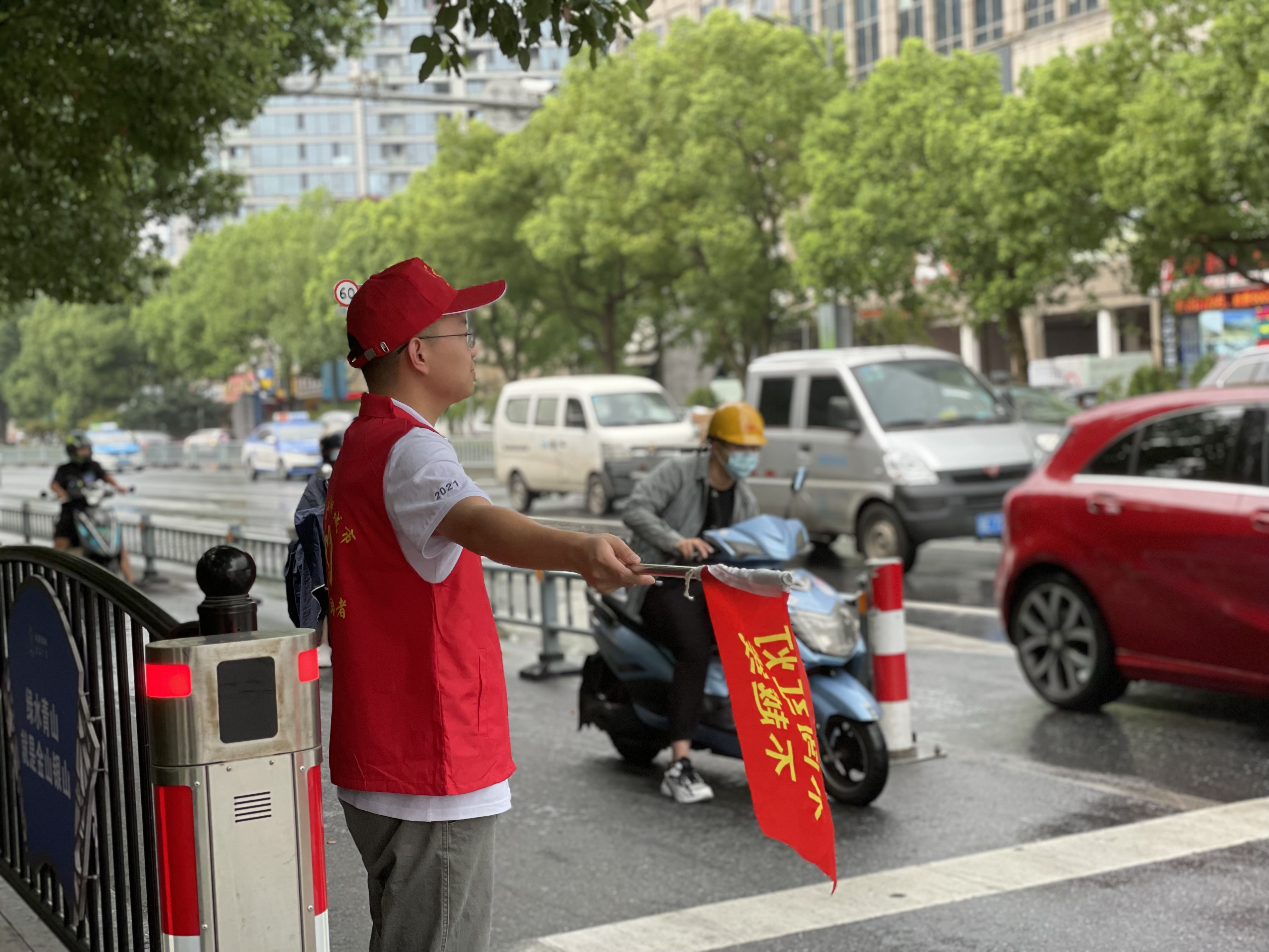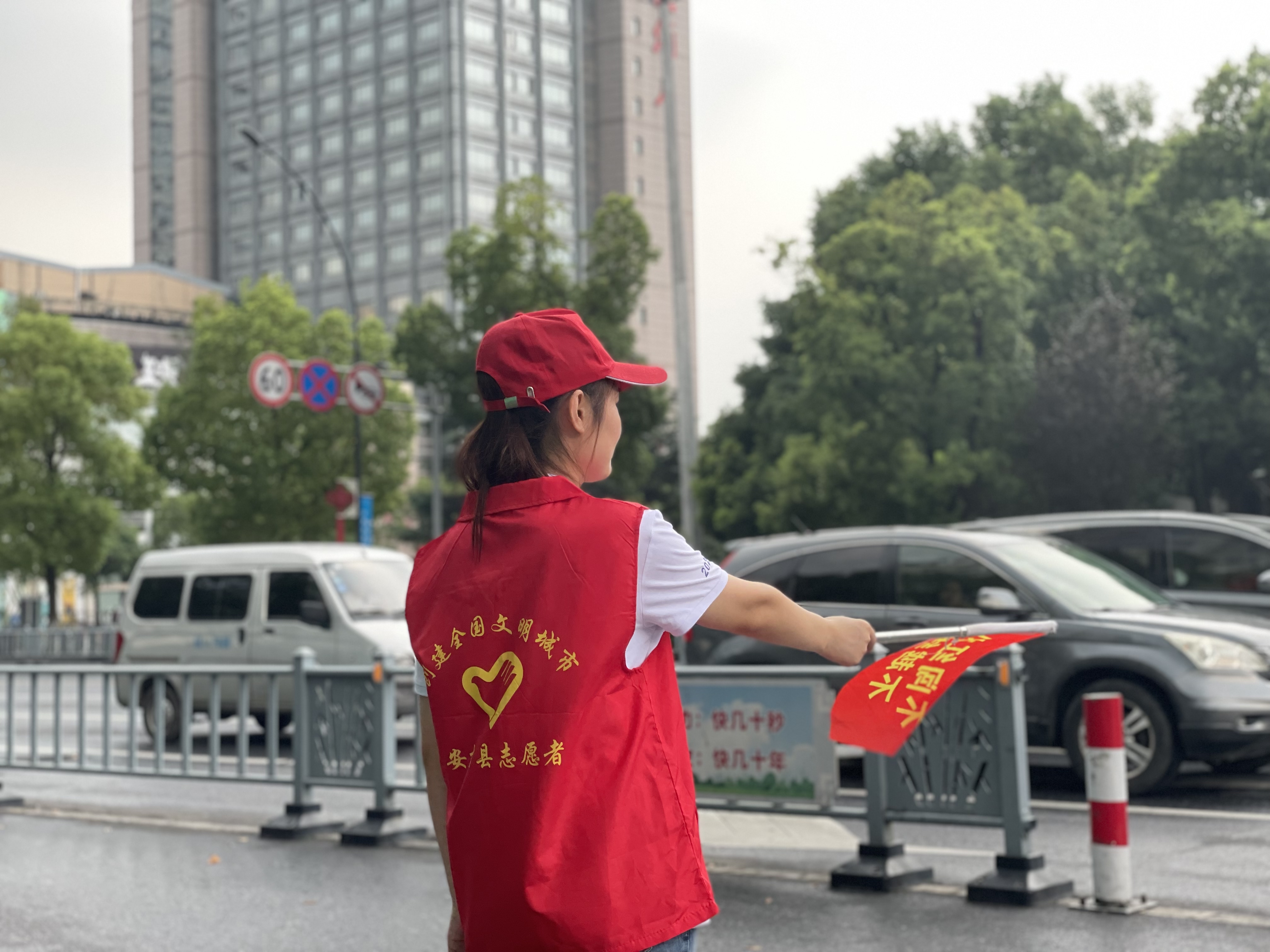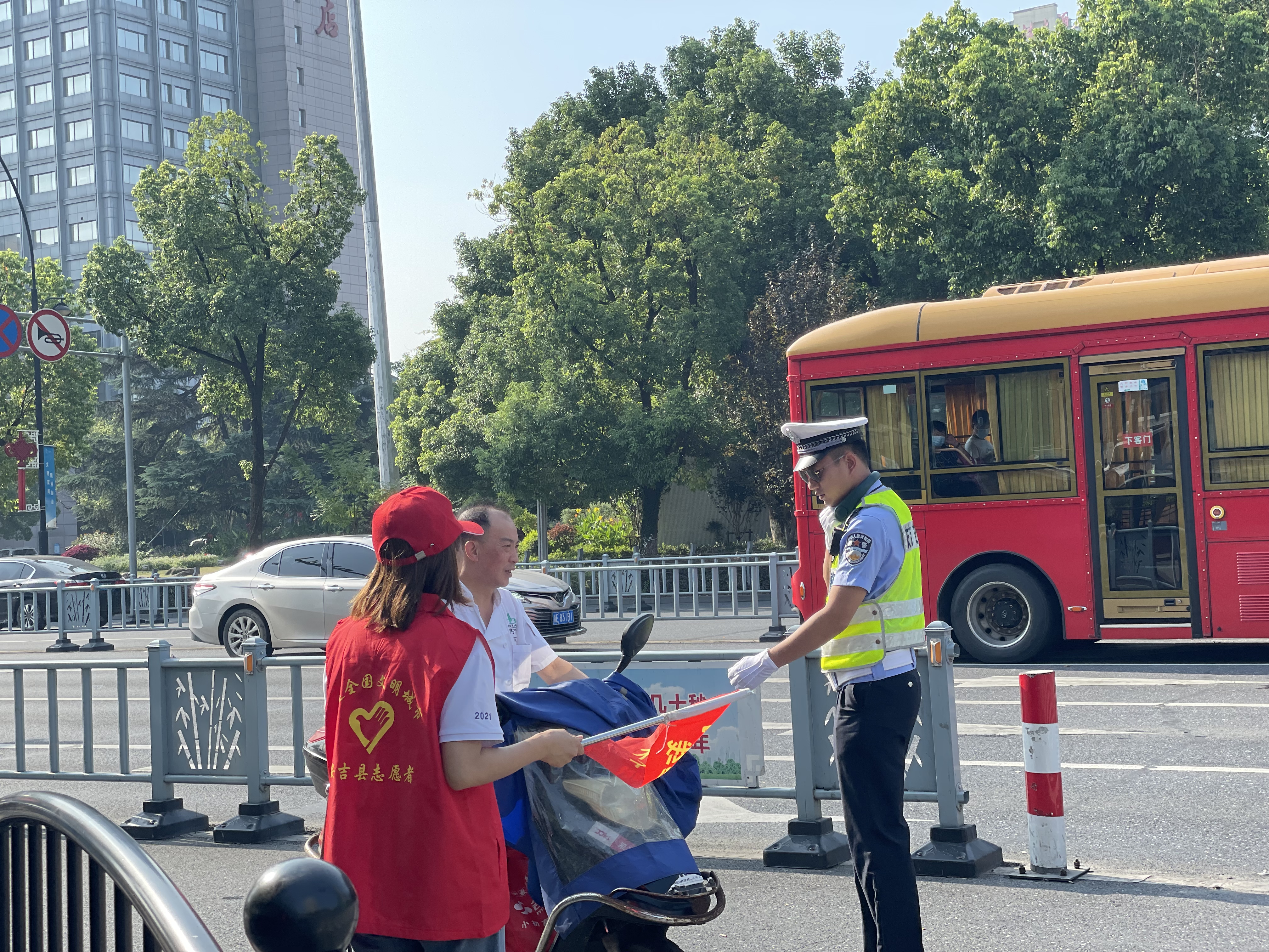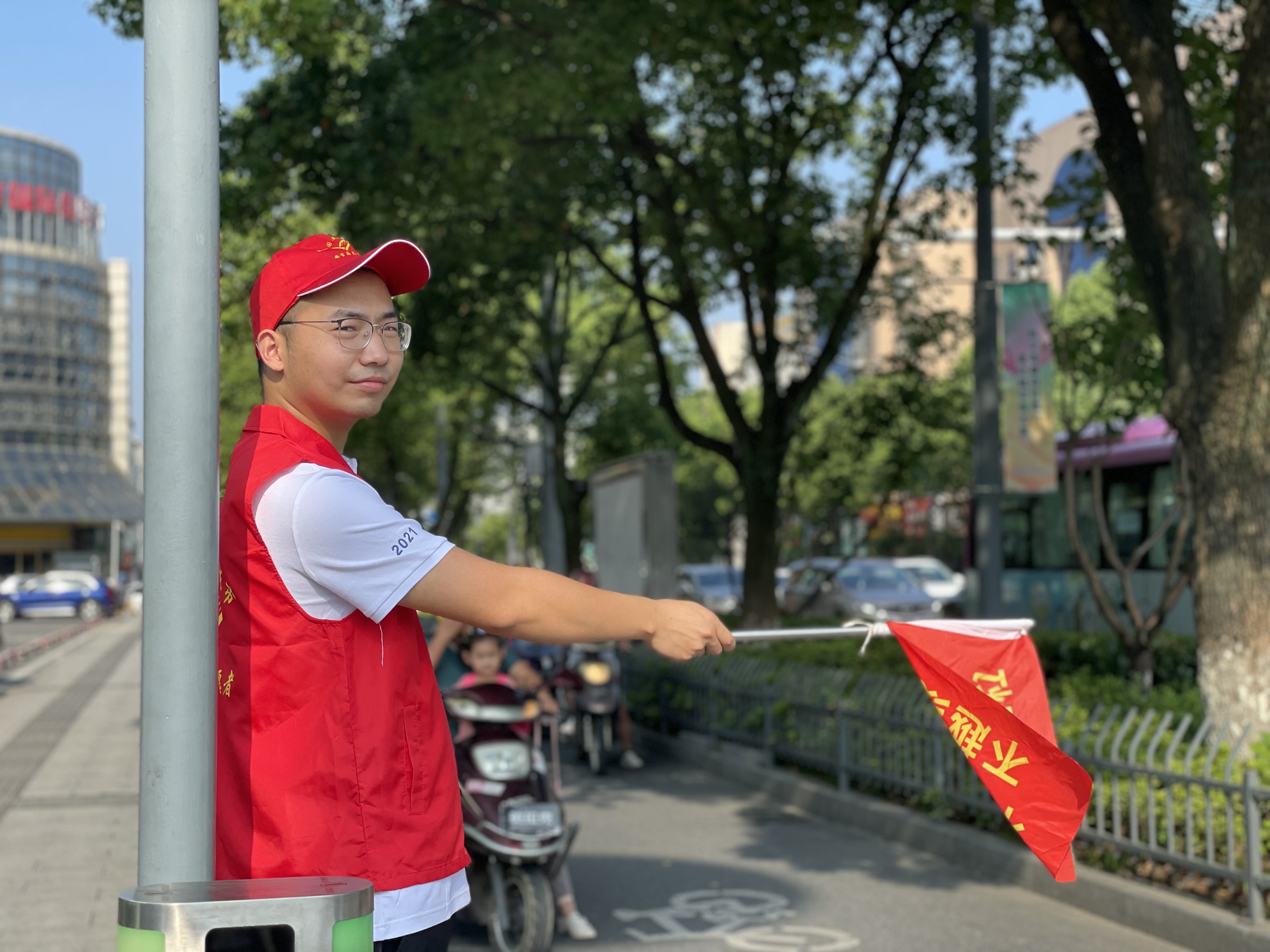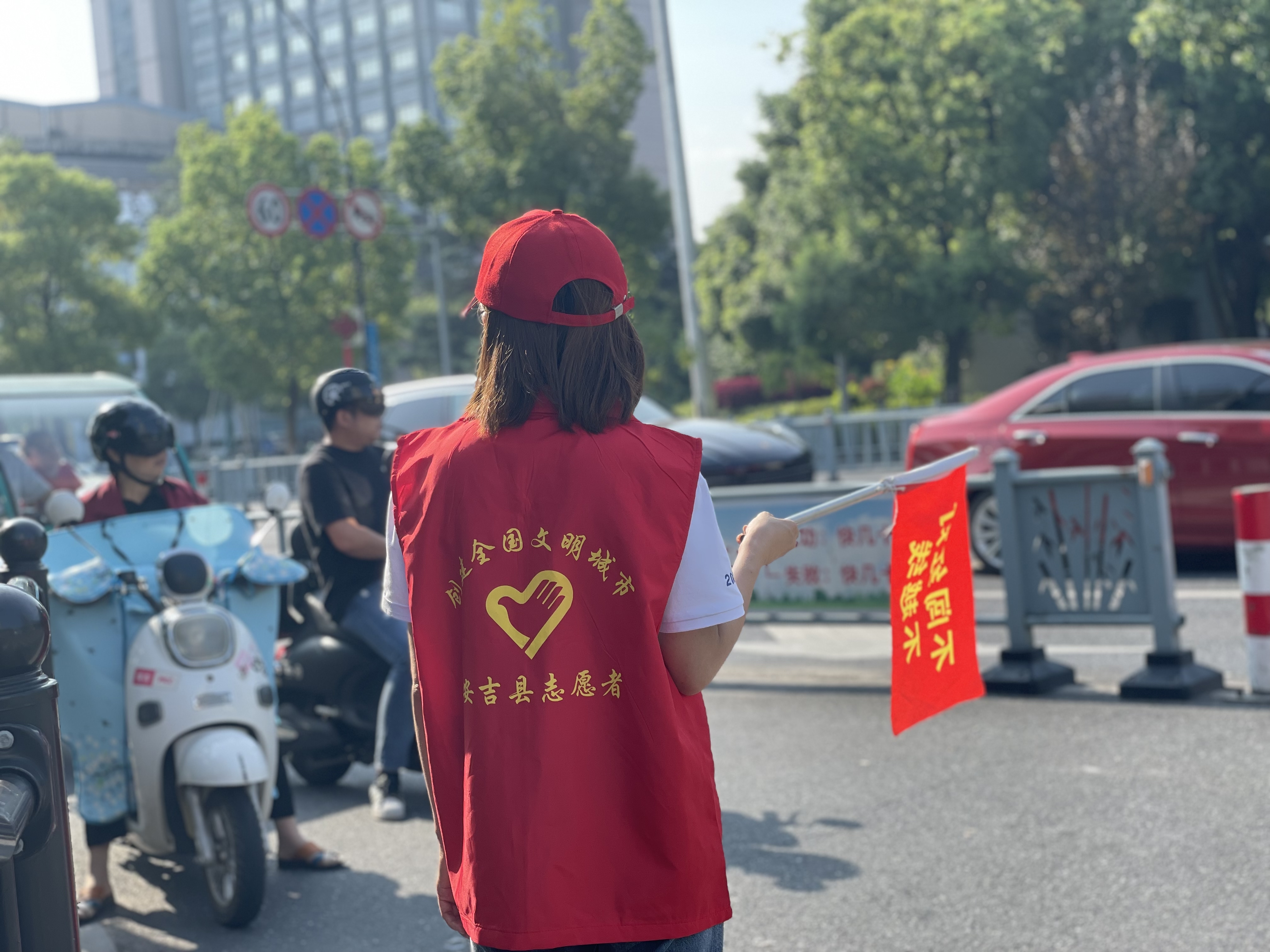 上午的安吉,天气炎热、阳光刺眼,志愿者们却站的笔直、面带微笑。他们说红色的志愿马甲穿在身上的时候,就代表着身上肩负着保卫城市的使命感与作为富特人的社会责任感。